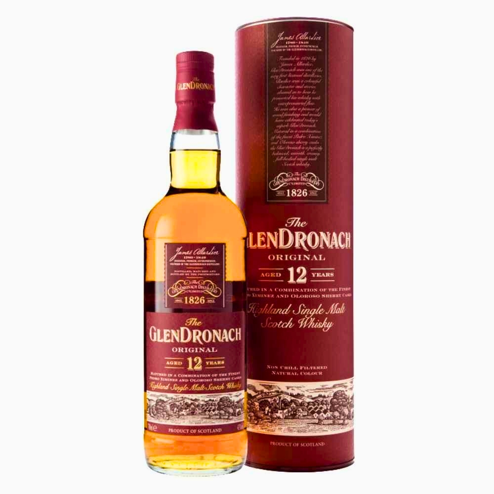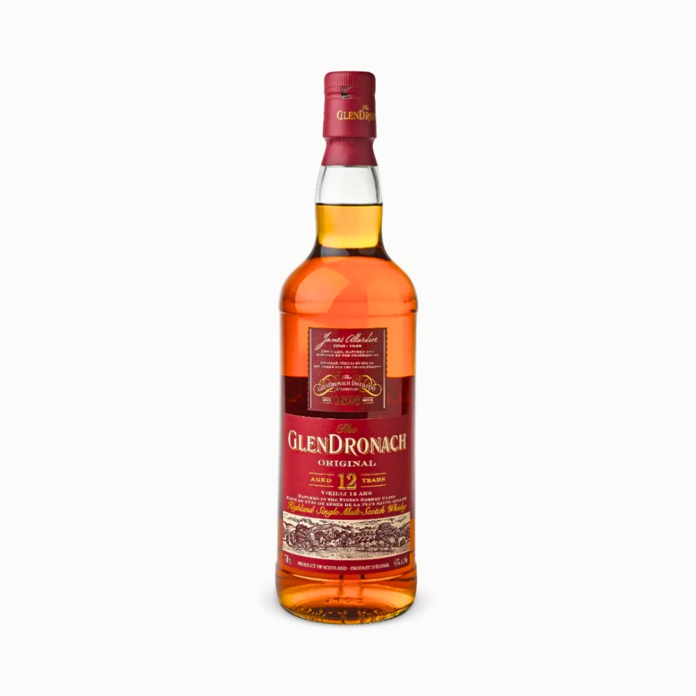 The Glendronach 12 Year Old Original is a premium Highland single malt Scotch whisky (750ml, 43% ABV) matured in Pedro Ximénez and Oloroso sherry casks. Known for its deep amber color, it offers a rich, creamy palate with notes of dried fruit, sherry sweetness, vanilla, and ginger, finished with oak spice