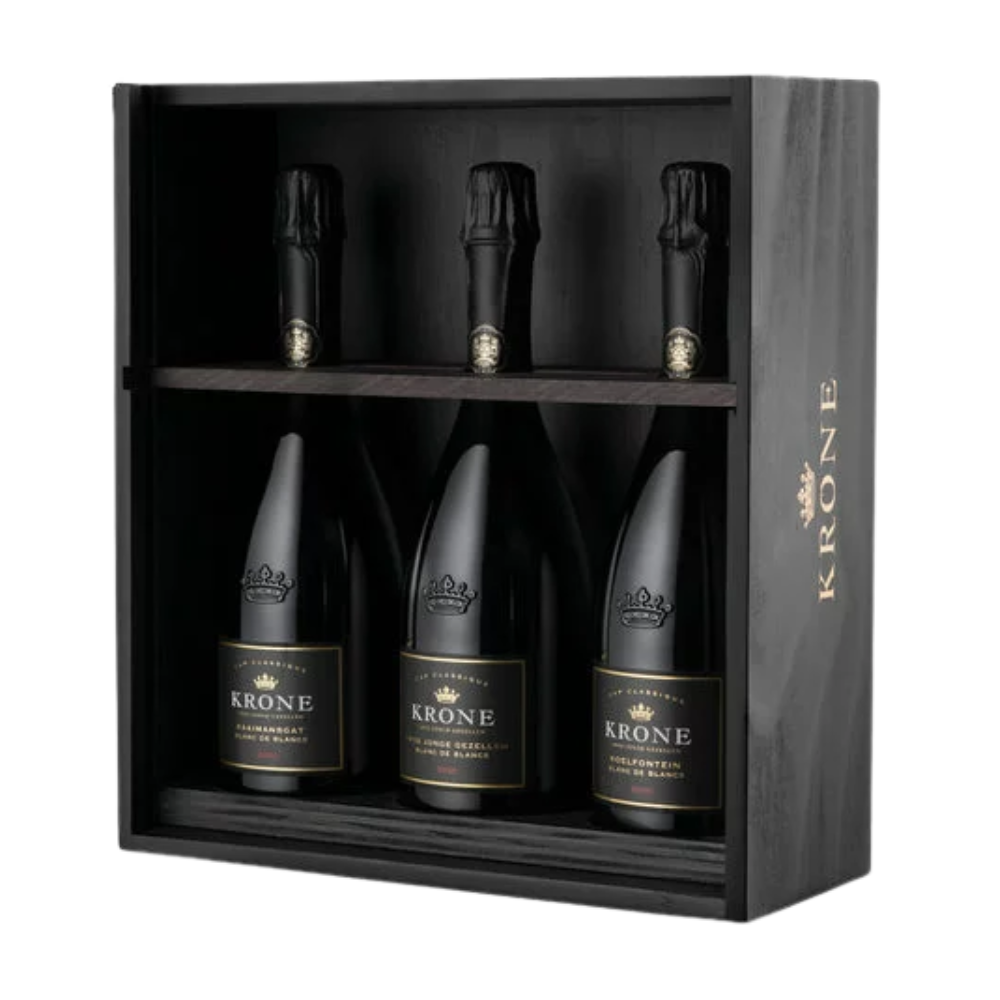 The Krone Blanc de Blanc Site Specific Collection Box (3 x 750ml) is an exclusive selection of three vintage Méthode Cap Classique sparkling wines, each made entirely from Chardonnay grapes sourced from distinct single-vineyard sites. This premium collection beautifully captures the essence of South Africa’s diverse terroirs, offering a refined profile of crisp citrus, green apple, and delicate brioche notes. Extended lees aging imparts a creamy texture and fine, persistent mousse, creating an elegant and complex tasting experience. Presented in a sophisticated gift box, it is perfect for collectors, connoisseurs, and special occasions.